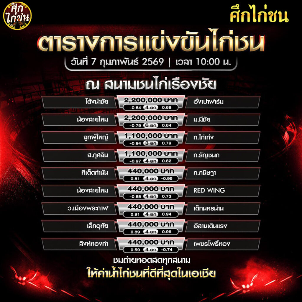 ตารางการแข่งขันไก่ชน (สนามชนไก่เรืองชัย) วันเสาร์ที่ 7 กุมภาพันธ์ 2569 (เวลา 10:00 น.)