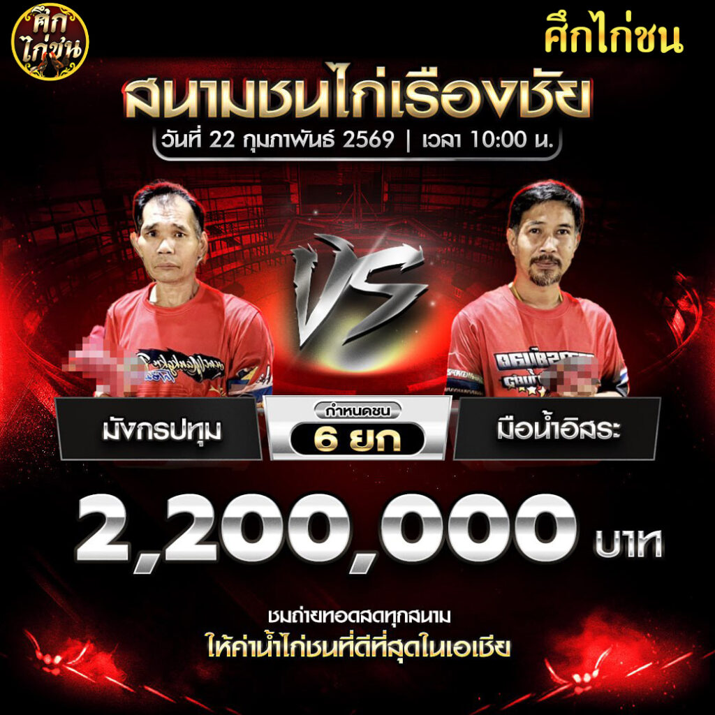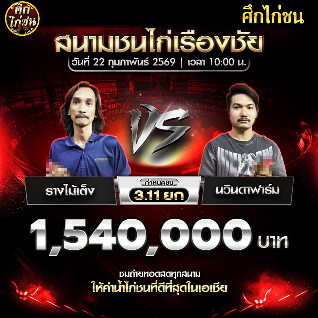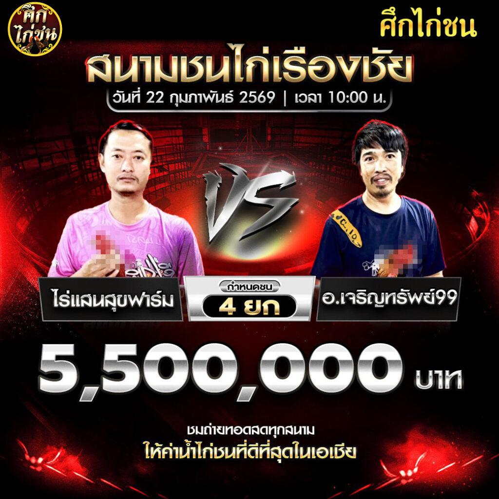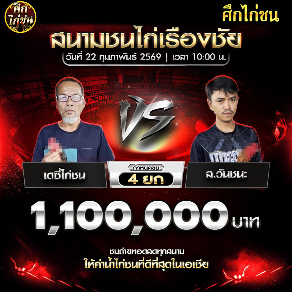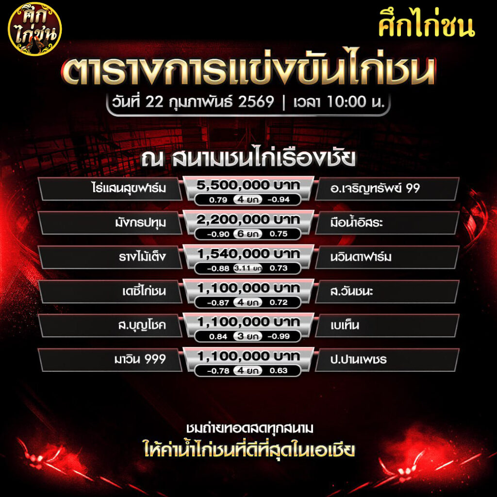 ตารางการแข่งขันไก่ชน (สนามชนไก่เรืองชัย) วันอาทิตย์ที่ 22 กุมภาพันธ์ 2569 (เวลา 10:00 น.)