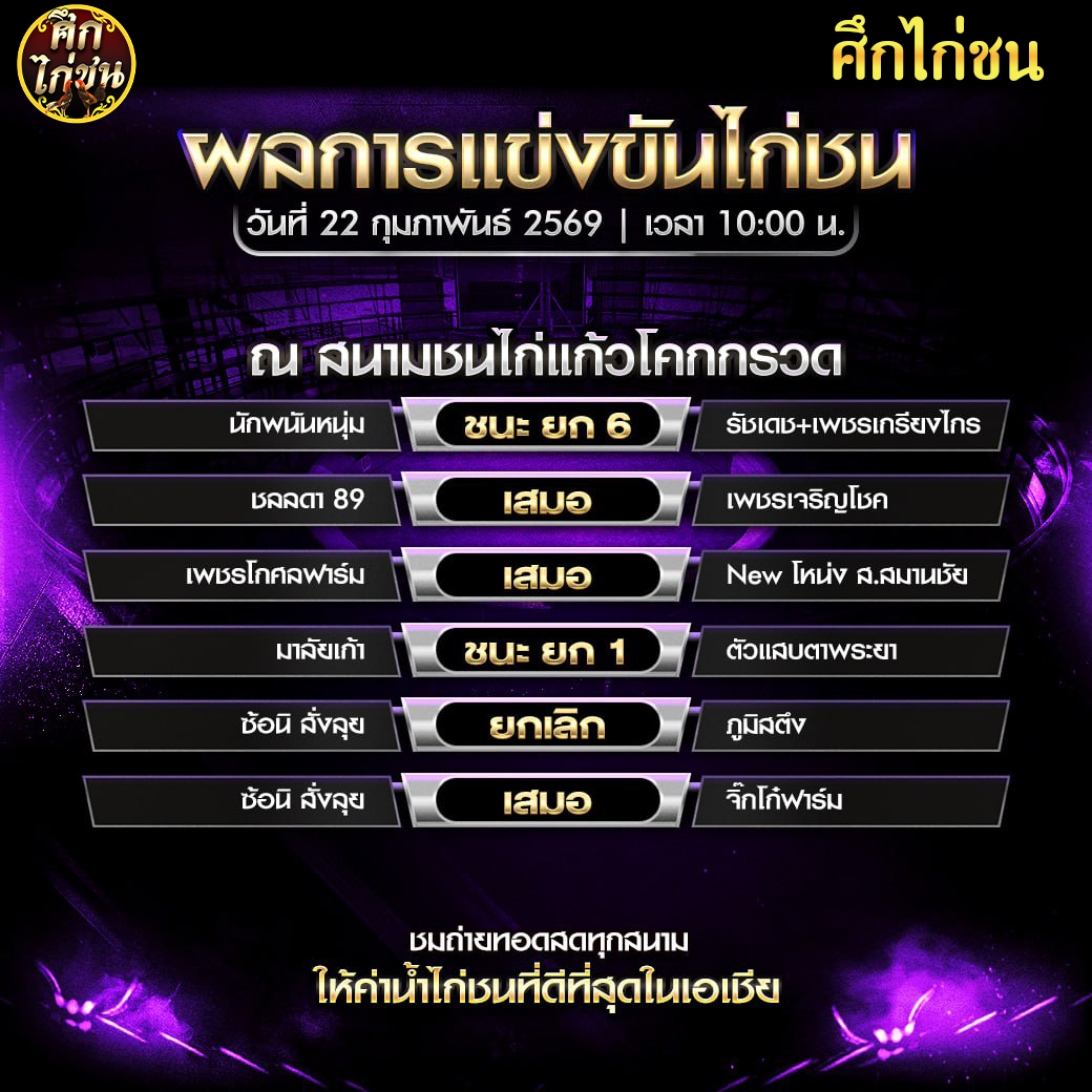 สรุปผล สนามชนไก่แก้วโคกกรวด วันอาทิตย์ ที่ 22 กุมภาพันธ์ 2569