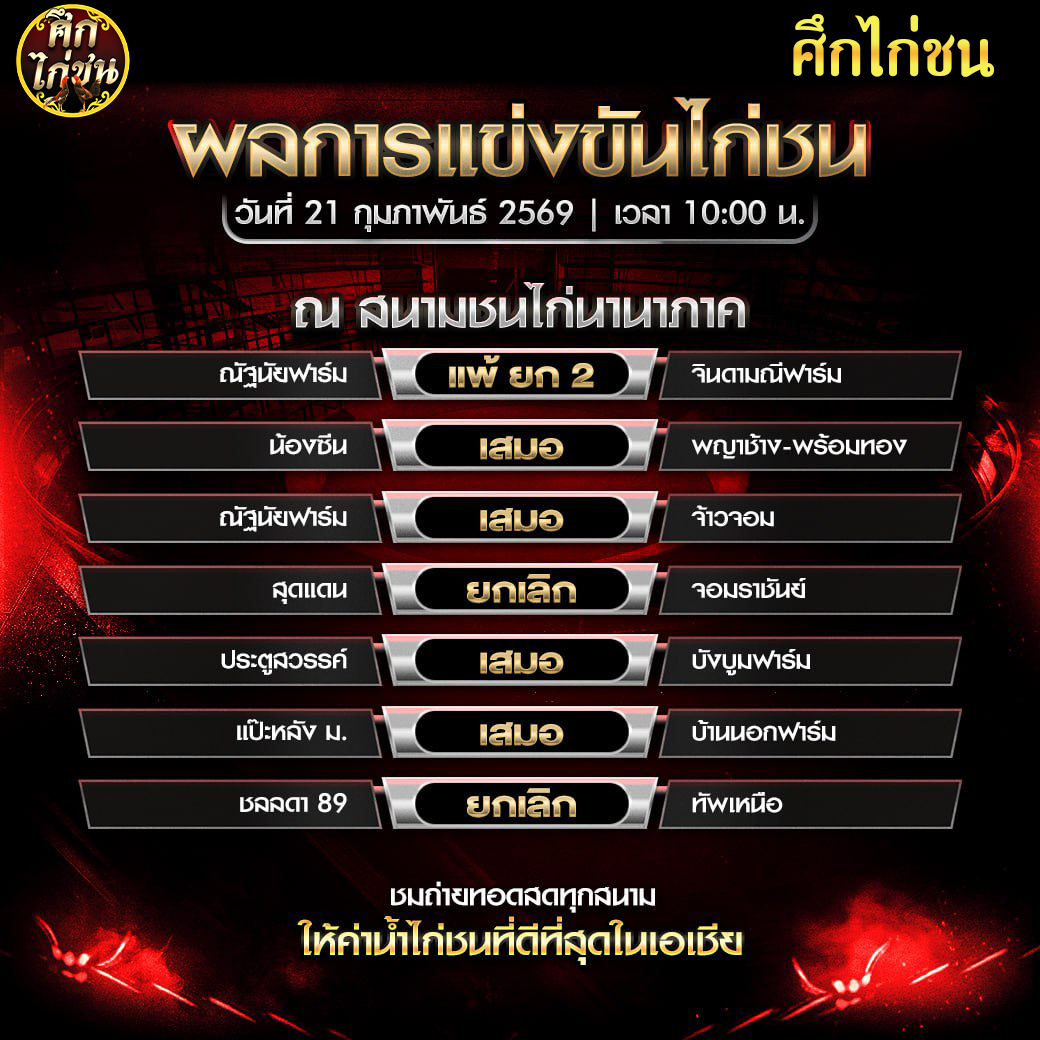 สรุปผล สนามชนไก่นานาภาควันเสาร์ ที่ 21 กุมภาพันธ์ 2569