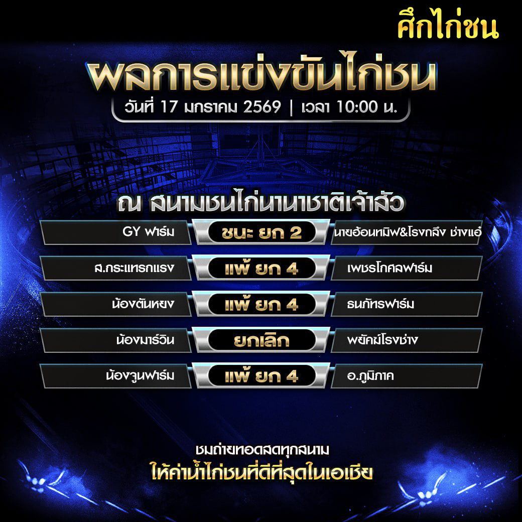 สรุปผล สนามชนไก่นานาชาติเจ้าสัว วันที่ 17 มกราคม 2569