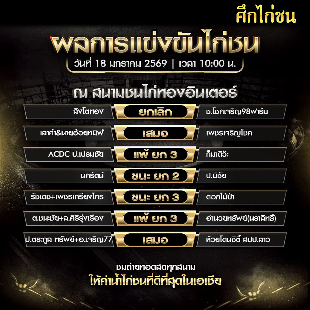 สรุปผล สนามชนไก่ทองอินเตอร์ วันที่ 18 มกราคม 2569