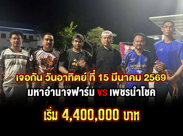 (มหาอำนาจฟาร์ม🆚เพชรนำโชค) สนามชนไก่ทองอินเตอย์ เริ่ม4.4M เจอกัน วันอาทิตย์ ที่ 15 มีนาคม 2569