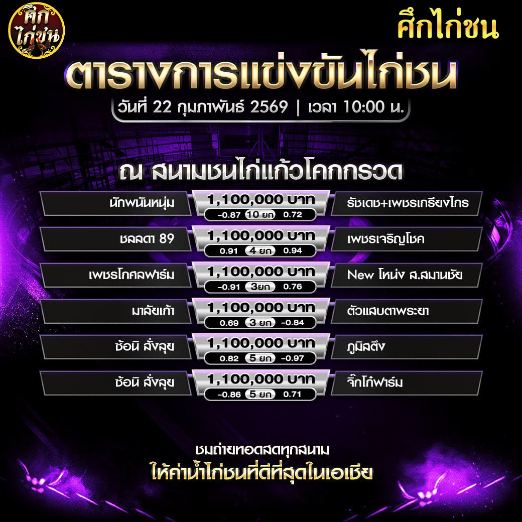 ตารางการแข่งขันไก่ชน (สนามชนไก่เรืองชัย) วันอาทิตย์ที่ 22 กุมภาพันธ์ 2569 (เวลา 10:00 น.)