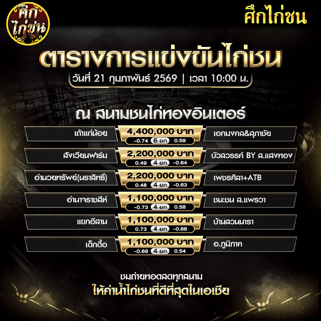 ตารางการแข่งขันไก่ชน (สนามชนไก่ทองอินเตอร์) เสาร์ที่ 21 กุมภาพันธ์ 2569 (เวลา 10:00 น.)
