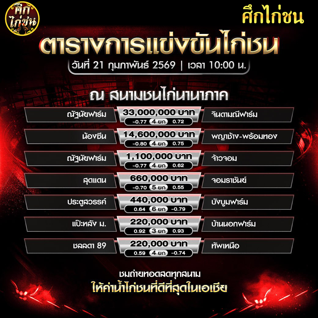 ตารางการแข่งขันไก่ชน (สนามชนไก่นานาภาค) วันเสาร์ที่ 21 กุมภาพันธ์ 2569 (เวลา 10:00 น.)